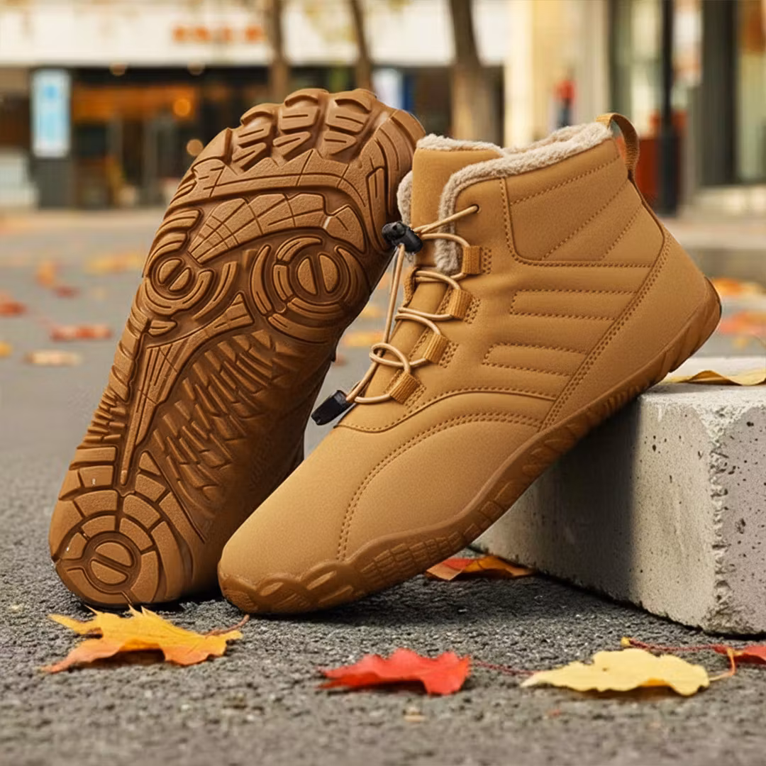 Disse grå barfodssko giver dig friheden til at gå, vandre eller motionere med din naturlige fodnedfældning, samtidig med at de holder dine fødder varme og tørre i løbet af efteråret og vinteren.