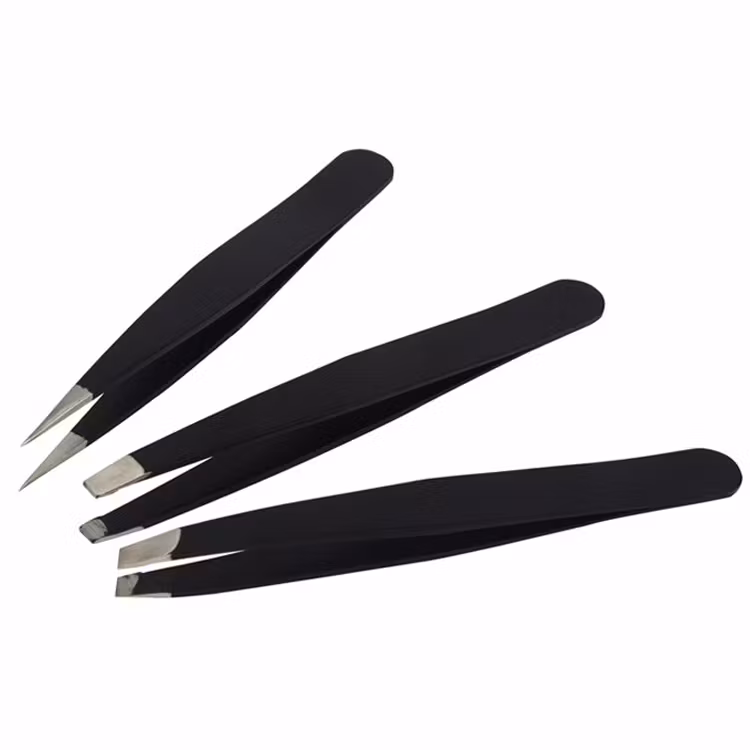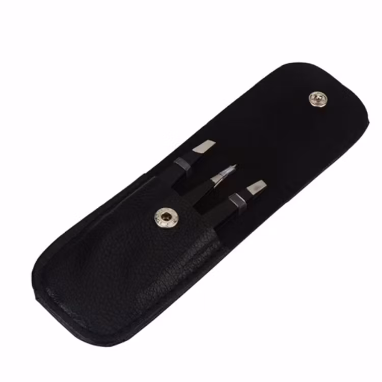 Tre forskellige typer pincetter i et flot og praktisk læderetui. Pincetterne er lavet af rustfrit stål og er af højeste kvalitet. De tre pincetter har en skarp, flad og skrå grebflade.
