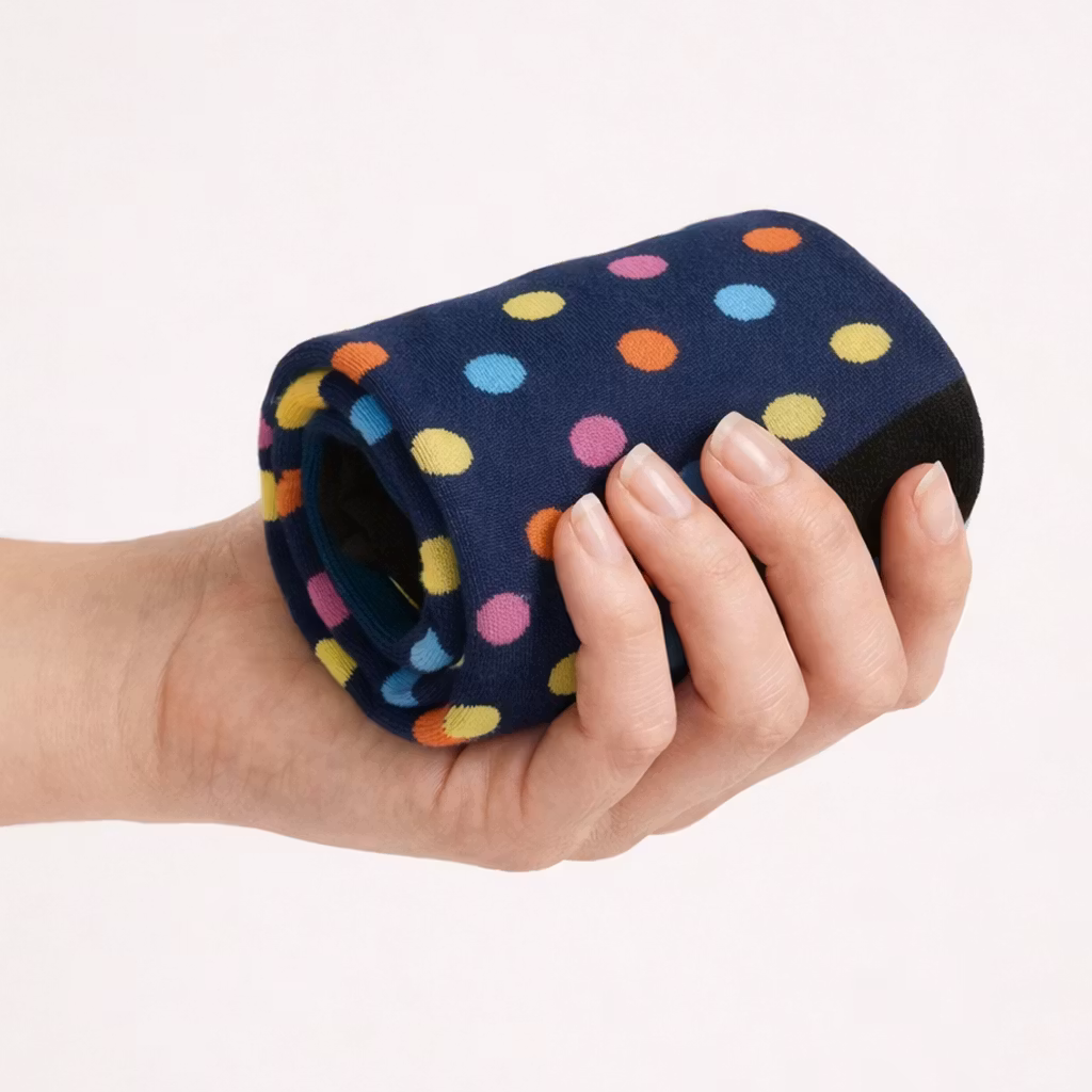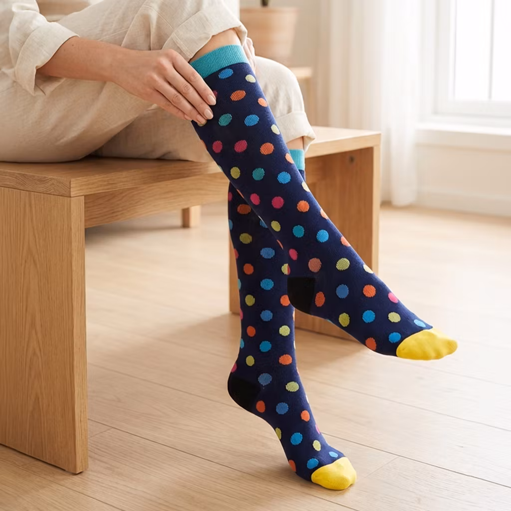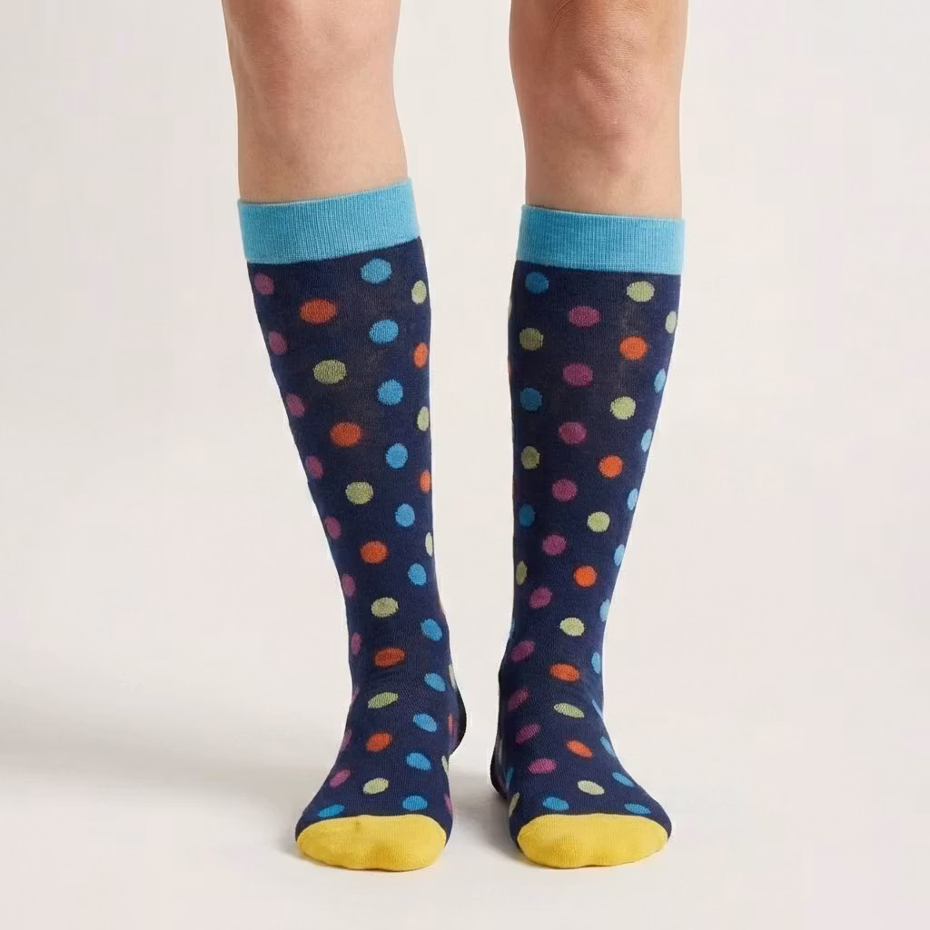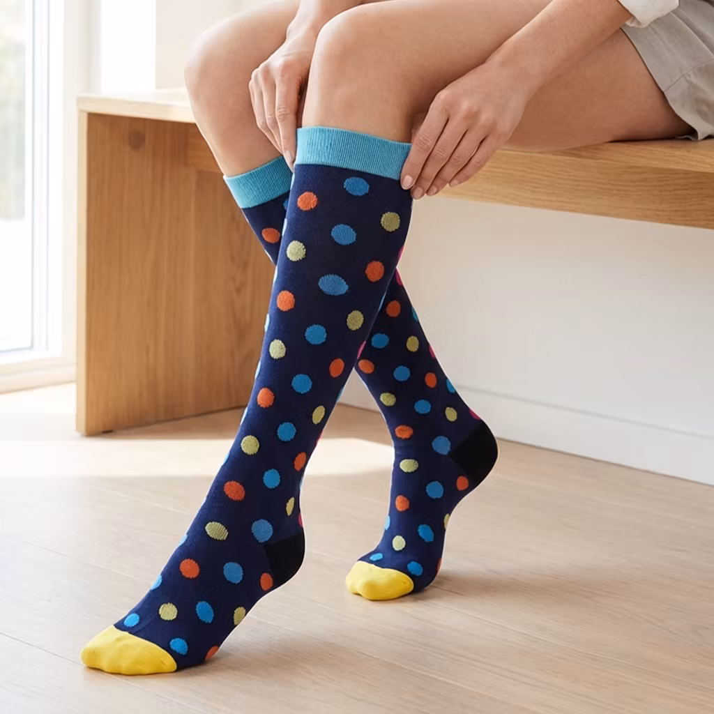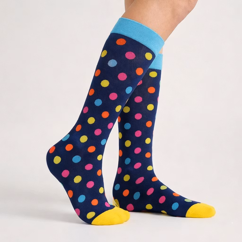 Et par dejlige støttestrømper i et prikket og farverigt mønster. Støttestrømperne giver kompression til dine ben, hvilket gør, at blodcirkulationen øges og hævelser og træthed reduceres i benene. Støttestrømper tjener som et fremragende hjælpemiddel for dig, der belaster benene meget i løbet af dagen.