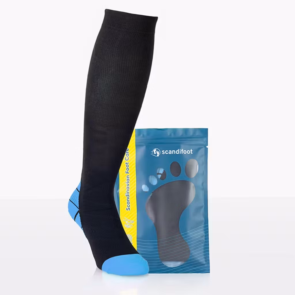Et par blå støttestrømper, der hjælper dig med at øge blodcirkulationen i fødder og ben. Støttestrømperne forebygger åreknuder, reducerer risikoen for skader under træningen og hjælper med at holde cirkulationen oppe på blandt andet flyveture