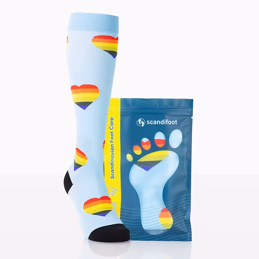 Et par lyseblå og skønne støttestrømper i et farverigt mønster med symboler af hjerter. Støttestrømper giver kompression til benene, hvilket øger blodcirkulationen. Dette reducerer hævelse og træthed i benene. Støttestrømper fungerer som et fremragende hjælpemiddel til dig, der belaster benene meget i løbet af dagen.