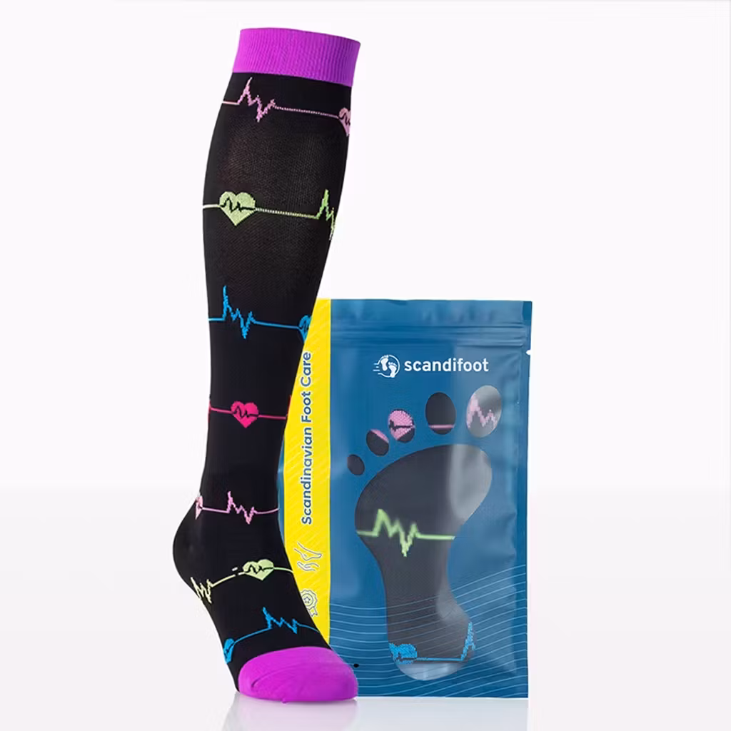 Et par vidunderligt livlige støttestrømper i et muntert motiv, der passer til dig, der arbejder inden for sundhedsvæsenet. Lange dage i stående stilling eller hvor du går meget, kan føles krævende for dine ben og fødder. Takket være disse skønne støttestrømper får dine ben og fødder en velkommen aflastning.