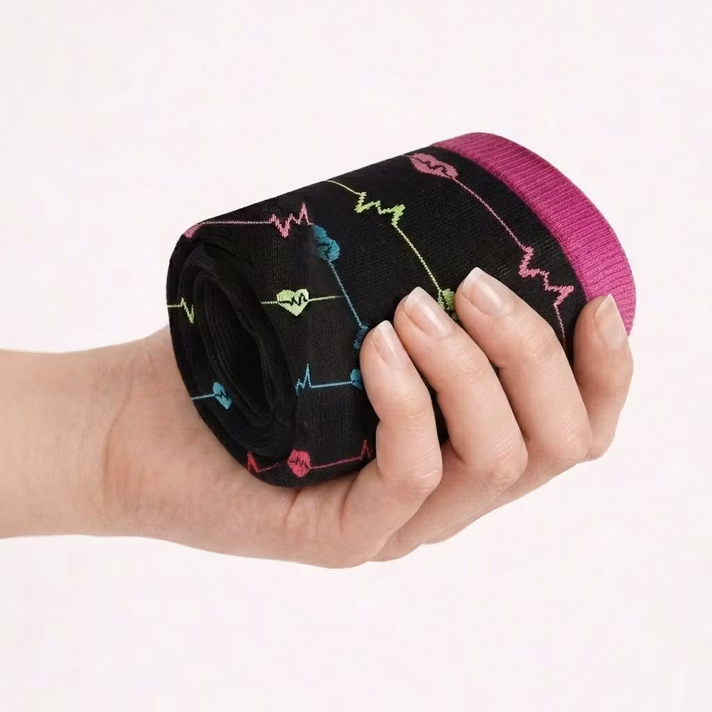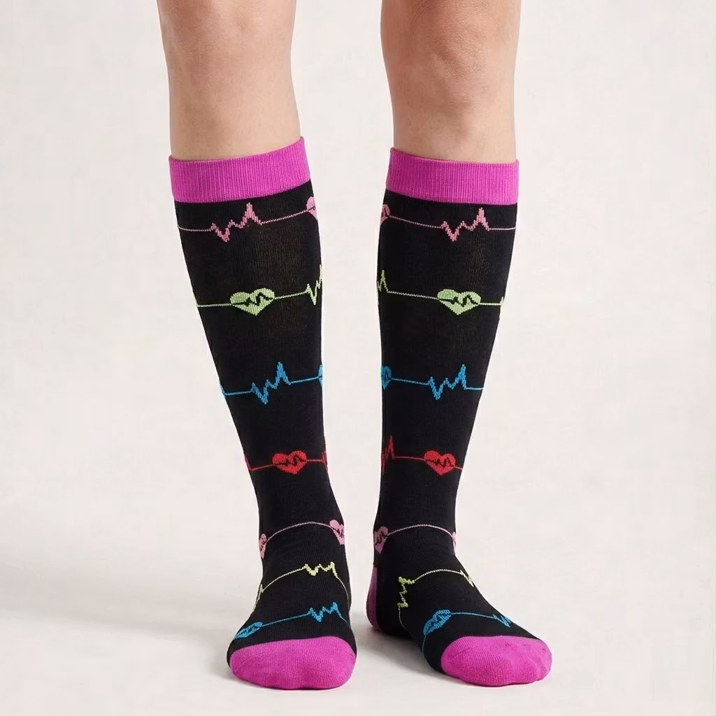 Disse støttestrømper passer fremragende til sundhedspersonale såsom læger, sygeplejersker, plejepersonale eller andre personer, der arbejder inden for sundhedsvæsenet. Det skønne, syede mønster med hjerterytmer på støttestrømperne taler for sig selv.