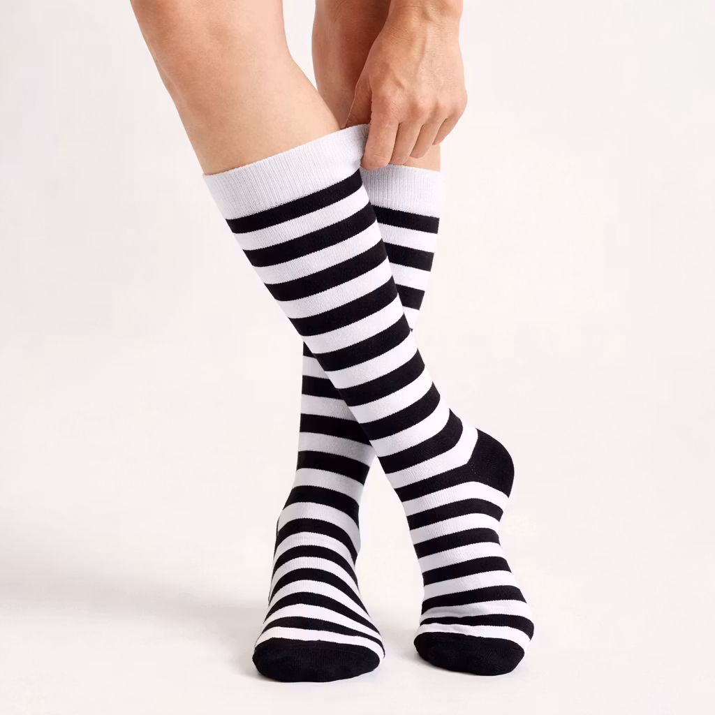 Et par sort- og hvidstribede støttestrømper, der hjælper dig med at øge blodcirkulationen i ben og fødder. Støttestrømperne forebygger blandt andet åreknuder, reducerer risikoen for skader, når du træner og hjælper med at opretholde cirkulationen ved f.eks. flyvninger