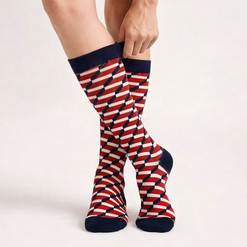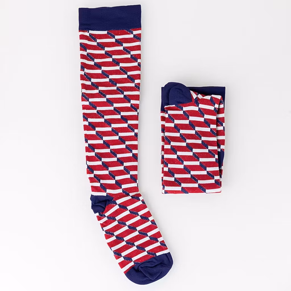 Et par røde og hvide ternede støttestrømper, der hjælper dig med at forbedre blodcirkulationen i dine ben og fødder. Ved at bruge støttestrømper forebygger du blandt andet åreknuder og reducerer risikoen for skader, når du træner. Du får også bedre blodcirkulation i benene, for eksempel under flyvninger.